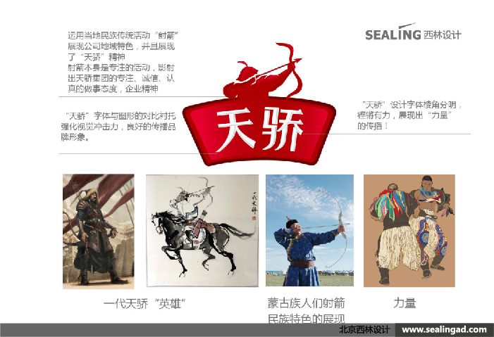 一代天驕“英雄”,運(yùn)用當(dāng)?shù)孛褡鍌鹘y(tǒng)活動(dòng)“射箭”展現(xiàn)公司地域特色,并且展現(xiàn)了“天驕”精神,射箭本身是專注的活動(dòng),影射出天驕集團(tuán)的專注、誠(chéng)信、認(rèn)真的做事態(tài)度,企業(yè)精神。天驕設(shè)計(jì)字體棱角分明,鏗鏘有力,展現(xiàn)出“力量”的傳播。
