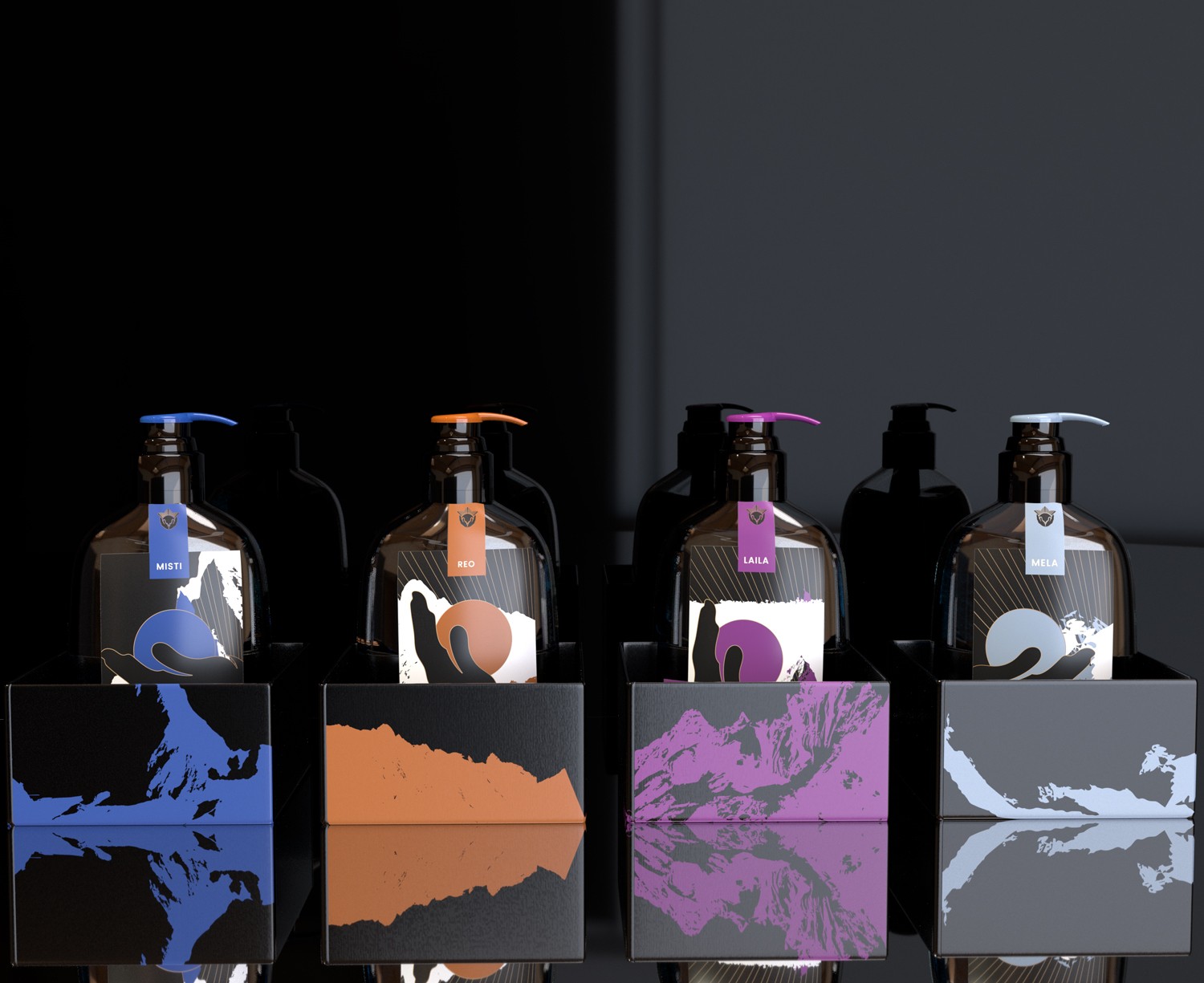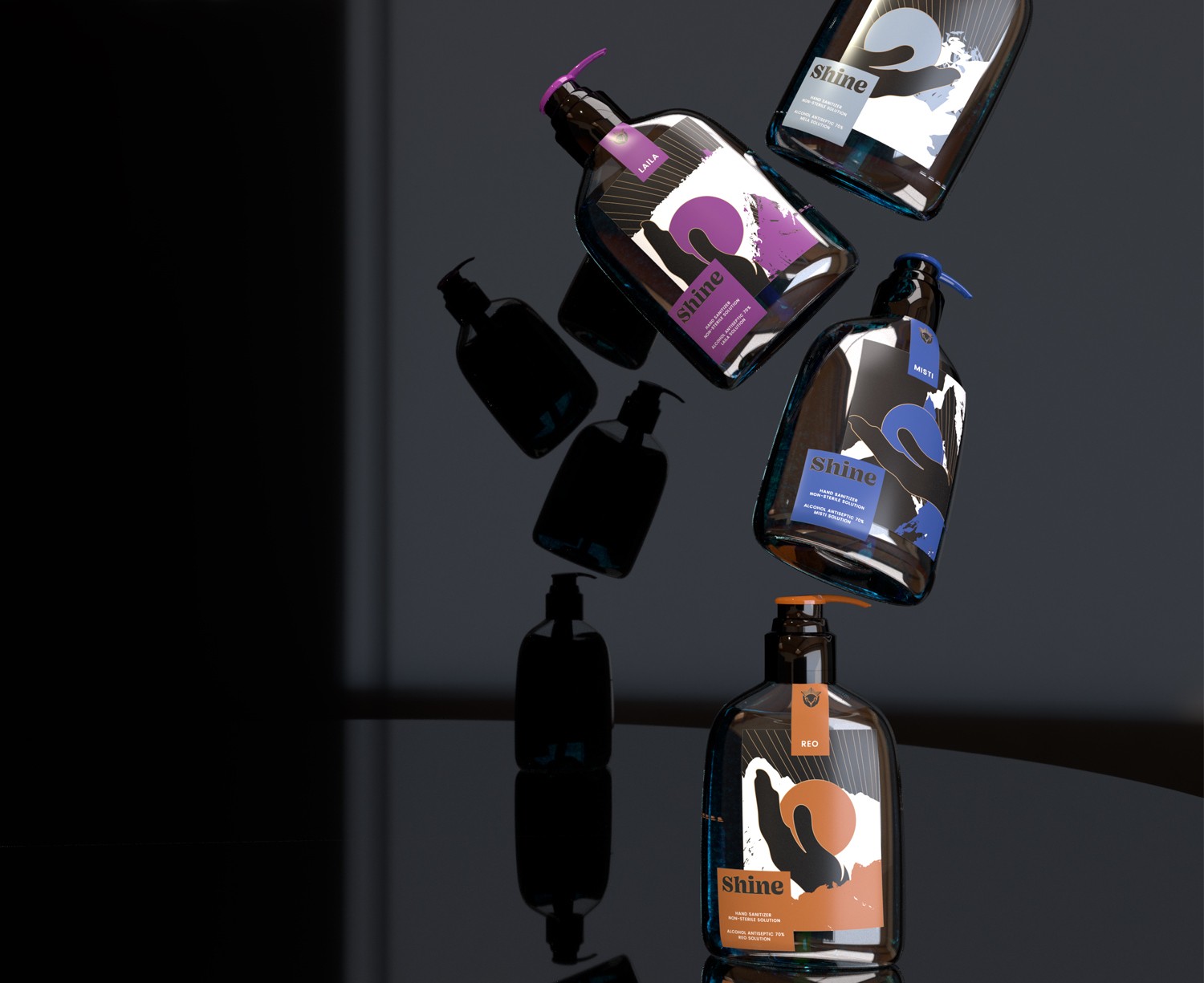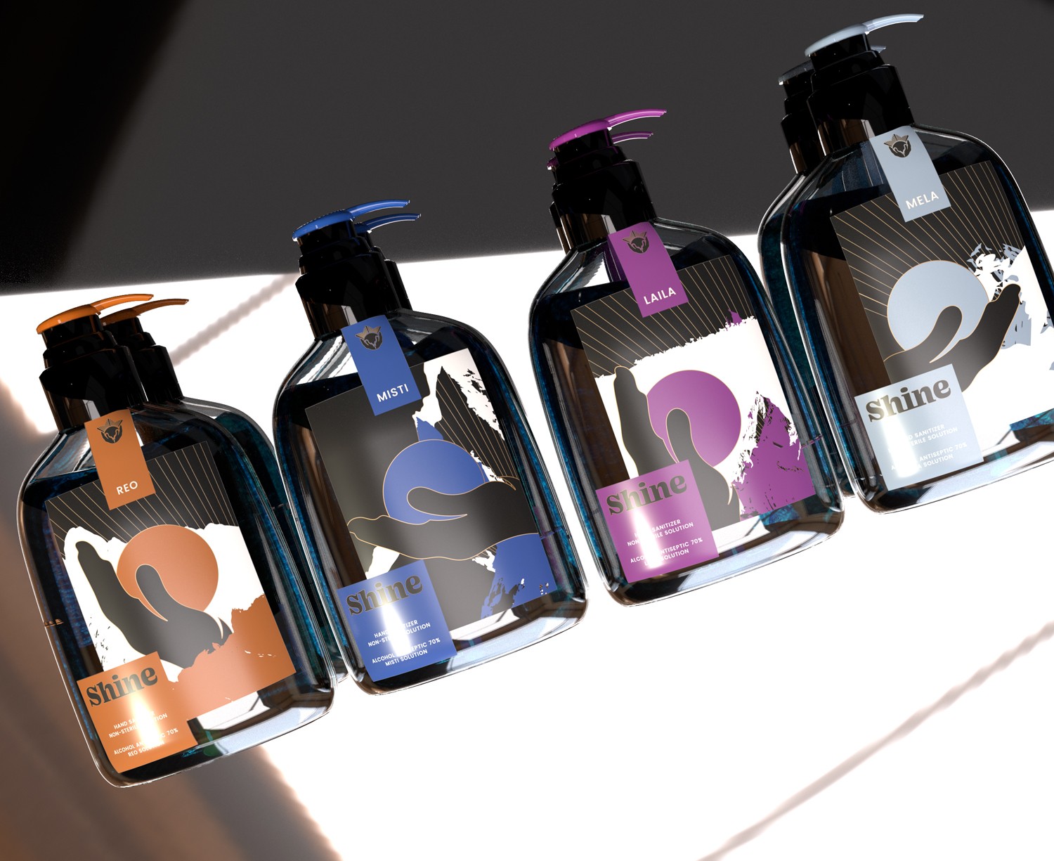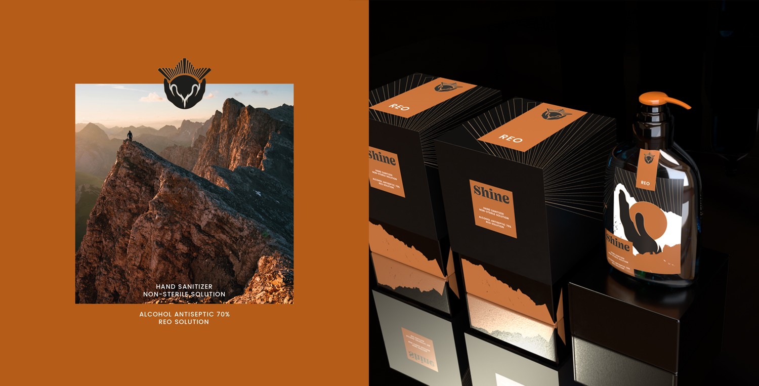包裝背后的理念是傳達高品位的外觀和感覺,以幫助品牌在市場中閃耀。標簽設計通過展示一只伸著太陽的手(比喻在手上使用消毒劑)與不同形狀的山脈以一種抽象的方式結合,圍繞忠誠、激情和移情的品牌核心價值體現了品牌信息。整個產品的色調選擇,以喚起不同季節(jié)的陽光照射在山上的氣氛。