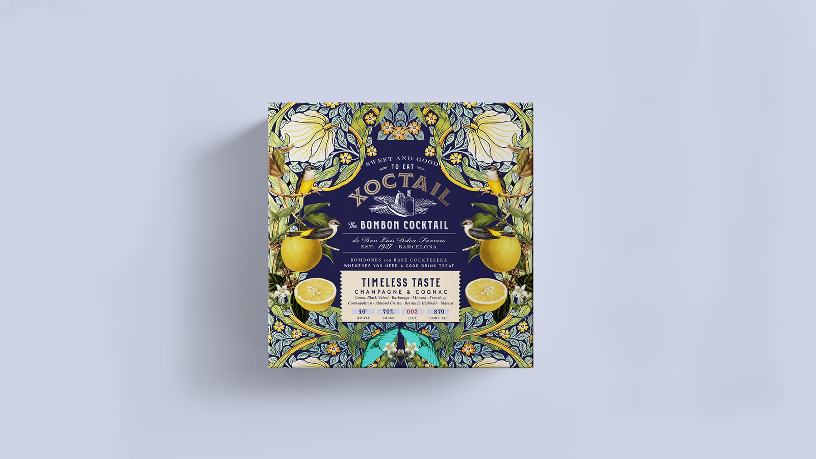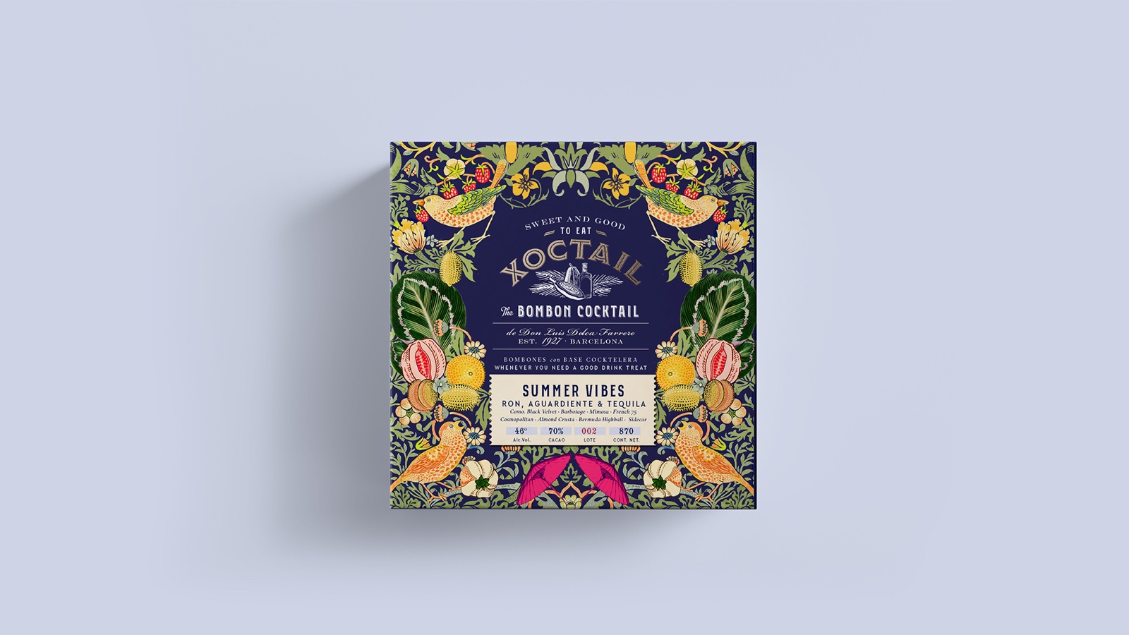 雞尾酒底巧克力包裝設(shè)計(jì)。靈感來(lái)源于威廉·莫里斯(1834-1896)的圖案。挑戰(zhàn)在于通過(guò)獨(dú)特大膽的口味,將非常傳統(tǒng)的產(chǎn)品與現(xiàn)代時(shí)尚的外觀結(jié)合起來(lái)。重塑傳統(tǒng)。