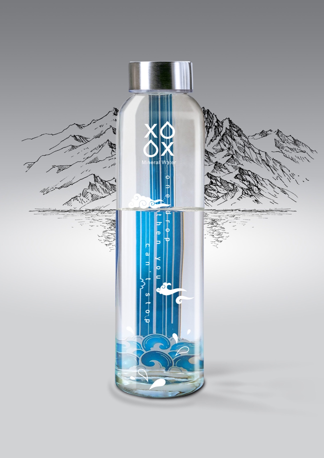 包裝設(shè)計(jì)師作者認(rèn)為礦泉水的品牌名為XO,通過(guò)將形式O轉(zhuǎn)換為水滴,X表示沒(méi)有水,以及XO的懷舊游戲,這兩個(gè)選項(xiàng)都是這個(gè)標(biāo)志的贏家,為給觀眾提供了選擇哪條道路的選項(xiàng)?. 為了設(shè)計(jì)包裝,水包裝設(shè)計(jì)師以簡(jiǎn)化的方式設(shè)計(jì)了一個(gè)靈感來(lái)自伊朗微型畫(huà)的瀑布,它被貼在玻璃背面作為雙面標(biāo)簽。瓶裝水的豐滿度以及水的折射對(duì)瀑布圖像的影響使瀑布變得越來(lái)越大、越來(lái)越寬。一起喝水會(huì)使瀑布變得更窄,水也更少。為了設(shè)計(jì)包裝,我以簡(jiǎn)化的方式設(shè)計(jì)了一個(gè)靈感來(lái)自伊朗微型畫(huà)的瀑布,它被貼在玻璃背面作為雙面標(biāo)簽。水的豐滿度和水的折射對(duì)瀑布圖像的影響使瀑布變得更大、更寬。每喝一杯,瀑布就會(huì)變得更窄,水也更少。“一滴,你就停不下來(lái)”的口號(hào)既強(qiáng)調(diào)了XO水的適口性,也強(qiáng)調(diào)了對(duì)這一重要儲(chǔ)備的濫用,這導(dǎo)致了一場(chǎng)環(huán)境災(zāi)難。將微型云朵放置在玻璃上,創(chuàng)造了一個(gè)帶有瀑布的三維空間。