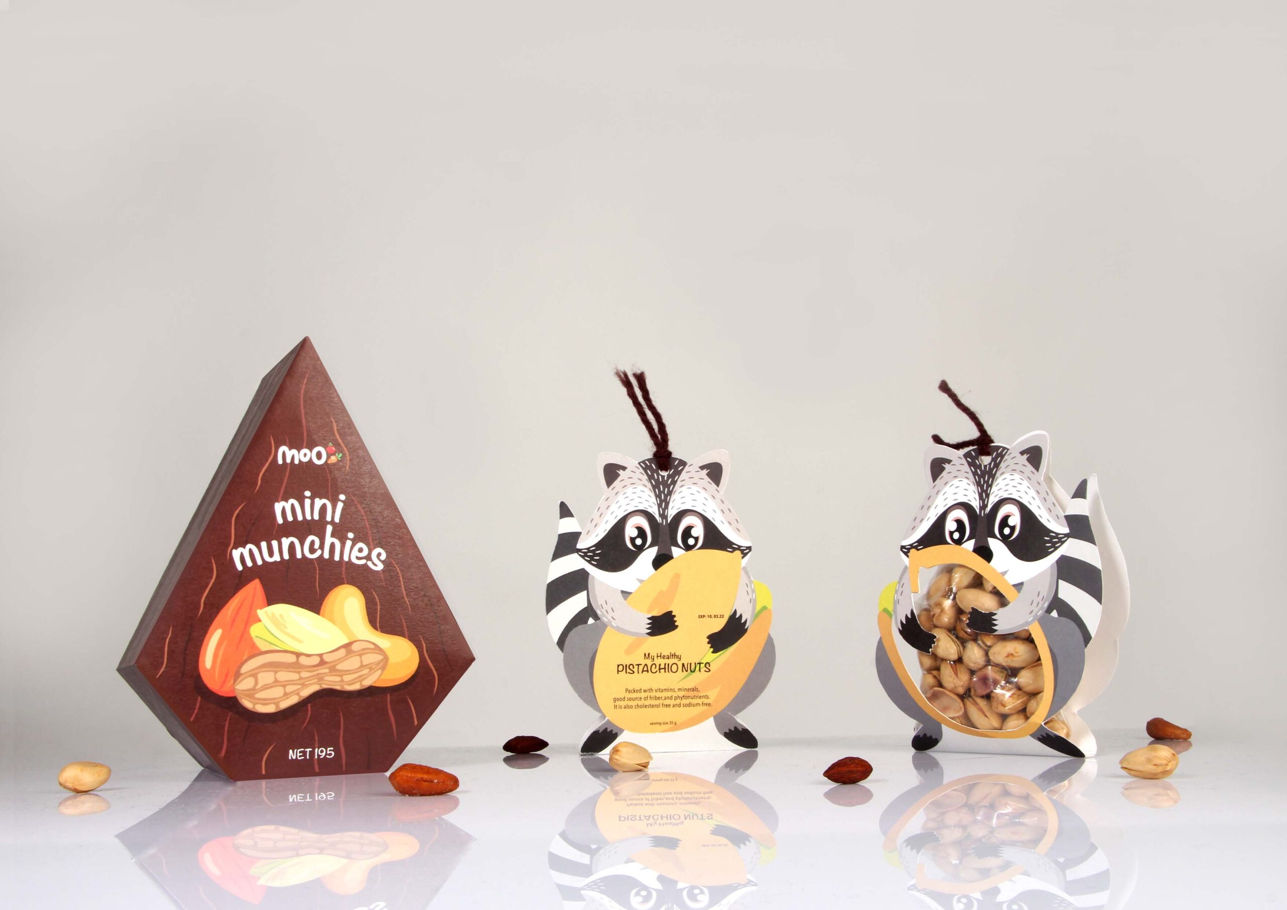 整體外包裝是一個鉆石形狀,旨在看起來像一個堅果本身。它也被設計成極簡主義風格,只有“迷你麥奇”的標題,正面有一個圖形元素。最后,堅果包裝內(nèi)的包裝由3種不同的動物組成,它們食用提供的不同堅果。這些動物是花栗鼠、松鼠和浣熊。背面設計包括有關螺母、凈重和有效期的信息。