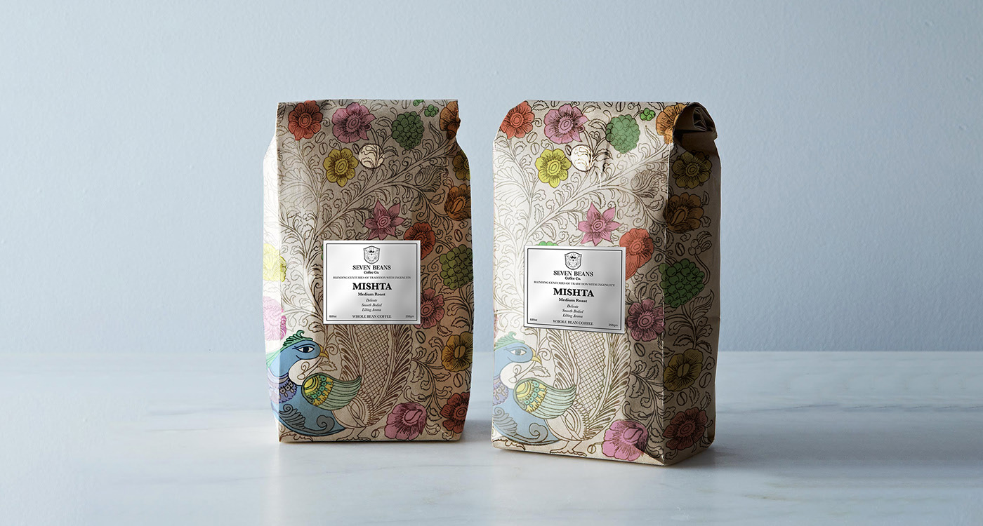 當下很多咖啡包裝由鋁、聚乙烯和錫組成,這些都是不可生物降解的。在這個項目中,設計師致力于開發(fā)Seven Beans咖啡公司的品牌標識,以及他們使用生物可降解材料包裝阿拉比卡咖啡豆。包裝設計師用再生香蕉葉紙做外包裝,用玉米淀粉塑料(由玉米油、橘皮和玉米淀粉制成的可生物降解塑料)做咖啡袋的內層。該項目的另一個目標是通過在包裝上整合不同風格的印度傳統(tǒng)藝術形式來支持印度本土藝術家。這將提高人們對各種藝術形式的認識和興趣(因為這種咖啡也是出口的)。