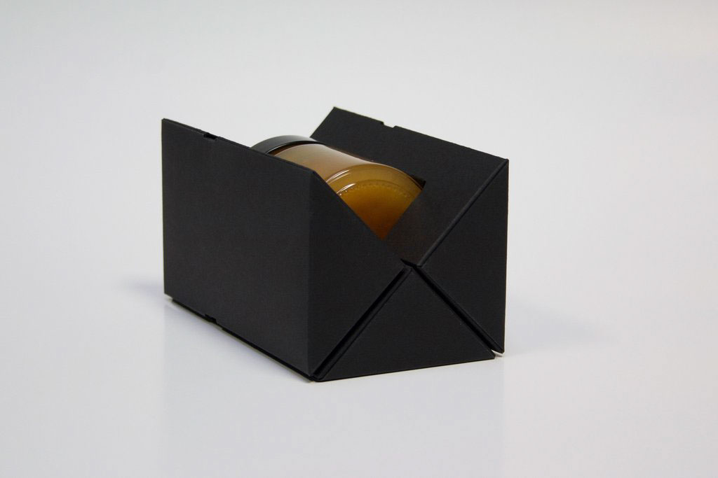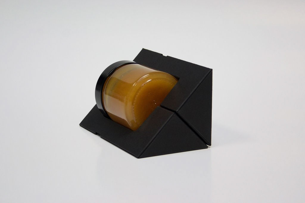 麥盧卡蜂蜜是一種蜂蜜,在新西蘭和澳大利亞新南威爾士北部的山坡、沿海地區(qū)、森林邊緣,生有一種叫做麥盧卡[也稱(chēng)曼努卡](manuka)的紅茶樹(shù)。每逢初夏,它盛開(kāi)的花朵會(huì)引得成群的蜜蜂來(lái)蜜源采集花蜜,以釀造獨(dú)具特色的麥盧卡蜂蜜?,F(xiàn)在分享的這一款麥盧卡蜂蜜TRUE MANUKA HONEY的包裝設(shè)計(jì),因?yàn)槭请娚啼N(xiāo)售產(chǎn)品,而且又是個(gè)玻璃瓶,對(duì)防撞要求比較高。設(shè)計(jì)形式區(qū)別于普通的蜂蜜設(shè)計(jì)形式,設(shè)計(jì)師巧妙通過(guò)瓦楞紙結(jié)構(gòu),做成一個(gè)三角度形狀,用四個(gè)三角形組成一個(gè)正方形的包裝,在里面通過(guò)模切做成一個(gè)緩沖區(qū),能夠很好的保護(hù)蜂蜜瓶。用黑色凸顯品質(zhì),黑白對(duì)比設(shè)計(jì)更加醒目,畫(huà)面設(shè)計(jì)非常簡(jiǎn)潔,給人感覺(jué)高端大氣又環(huán)保。給人以厚重可信賴(lài)的高端感覺(jué)。配色產(chǎn)品“蜂蜜”本身的黃金色,這種色彩上的醒目對(duì)比很容易凸顯蜂蜜作為自然甜品的美味,而引發(fā)食欲,進(jìn)而引發(fā)購(gòu)買(mǎi)行為。