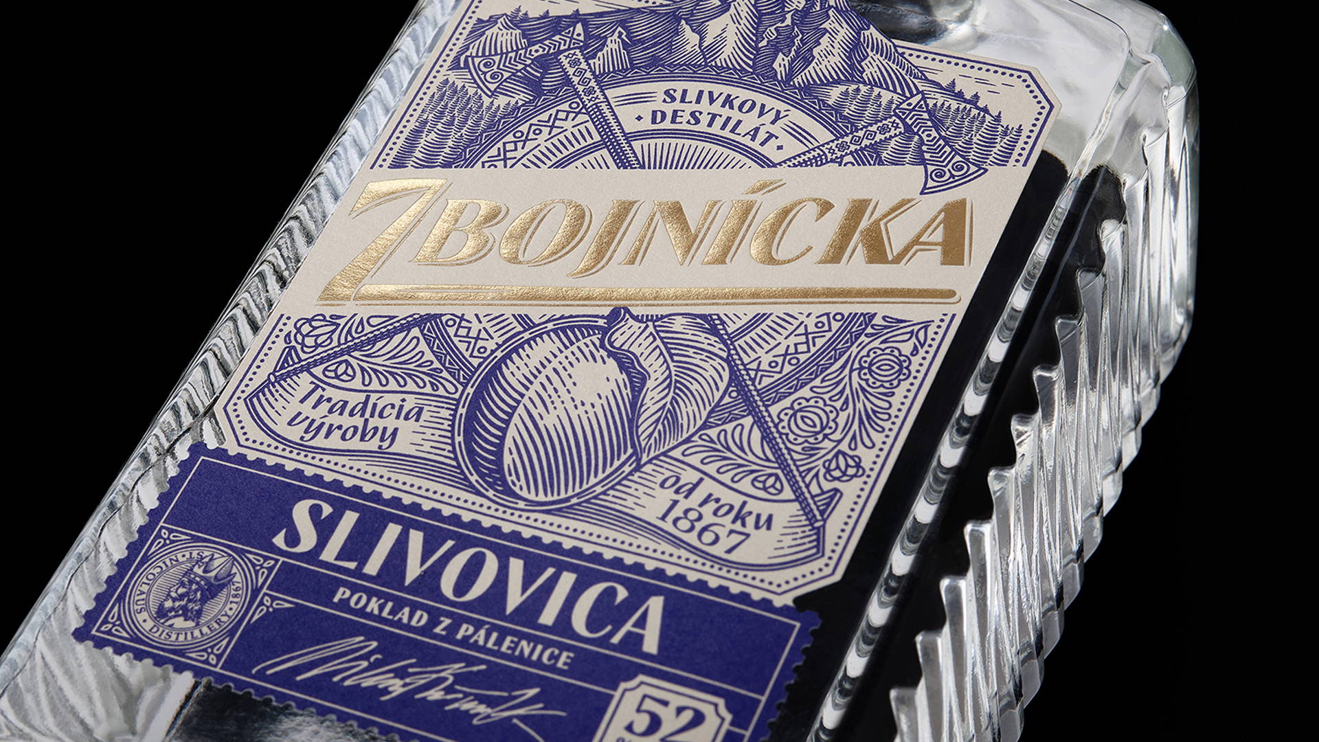 我們選擇了質(zhì)地柔軟的冰霜紙,以喚起一種天然的、自制的產(chǎn)品的感覺。雕刻風(fēng)格的插圖創(chuàng)造了一種被轉(zhuǎn)移到過去的印象。Zbojníks使用的十字牧羊人斧頭和一個飾以Mala Fatra地區(qū)傳統(tǒng)裝飾品的盾牌被放置在標(biāo)簽的中央。它們共同象征著Zbojníks人的特征--他們好戰(zhàn)的本性,愿意戰(zhàn)斗和保護(hù)他們的珍寶。標(biāo)簽的頂部是著名的韋爾克羅祖特克山的雕刻插圖,根據(jù)傳說,這里藏有許多珍寶。這種來自不同地區(qū)的斯洛伐克裝飾品的組合,增強了一個真正的本地,傳統(tǒng)產(chǎn)品的形象。