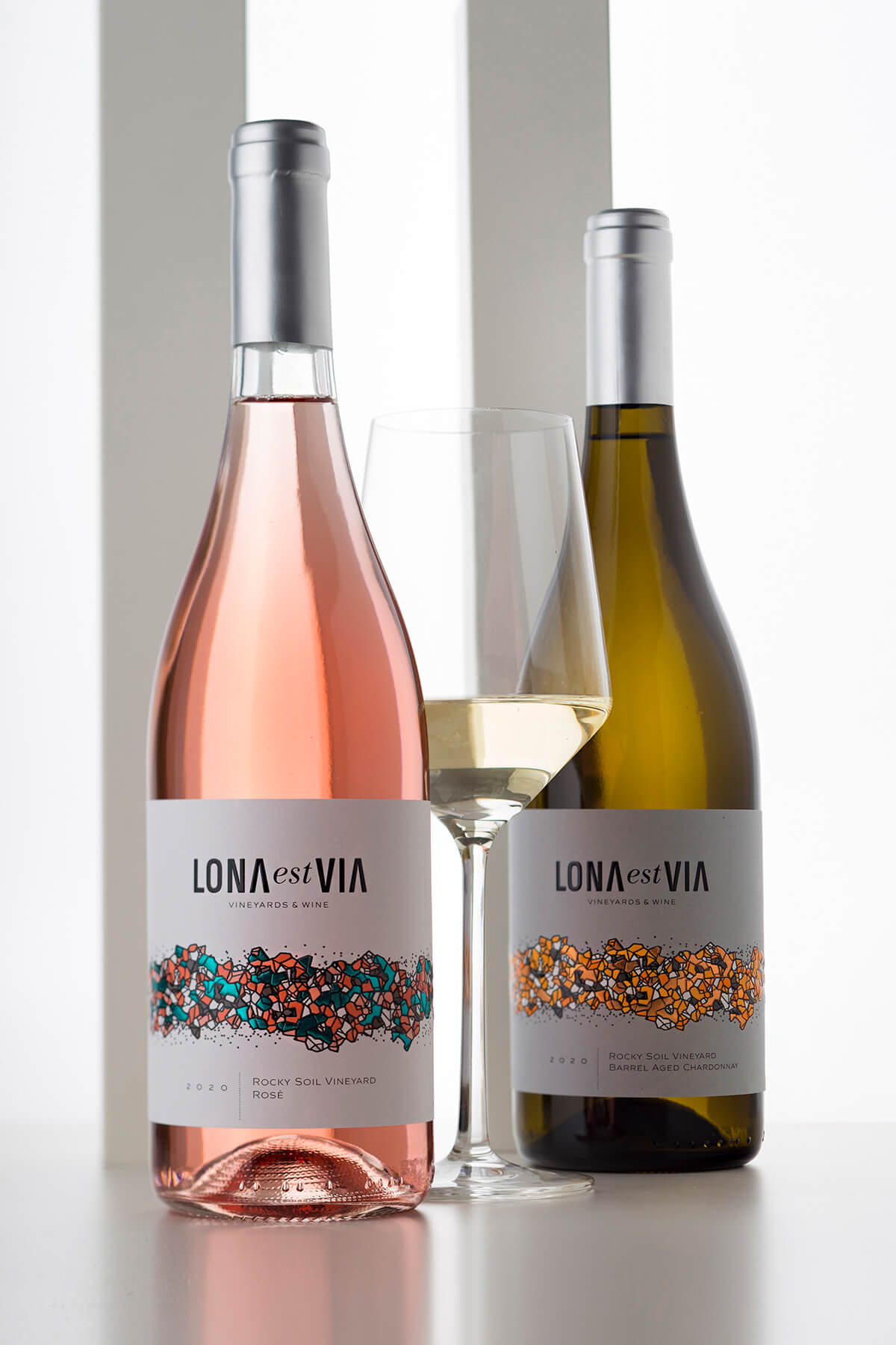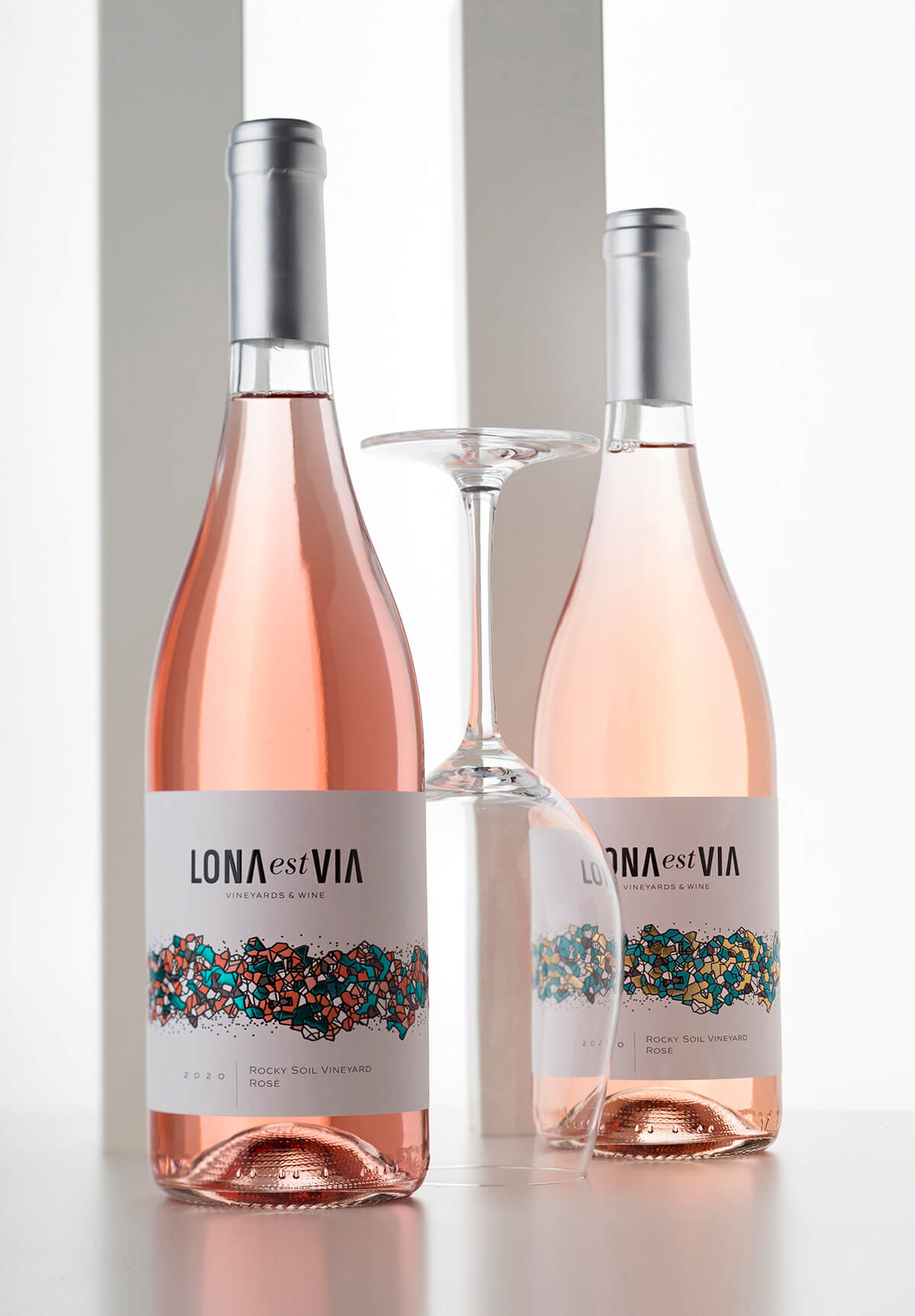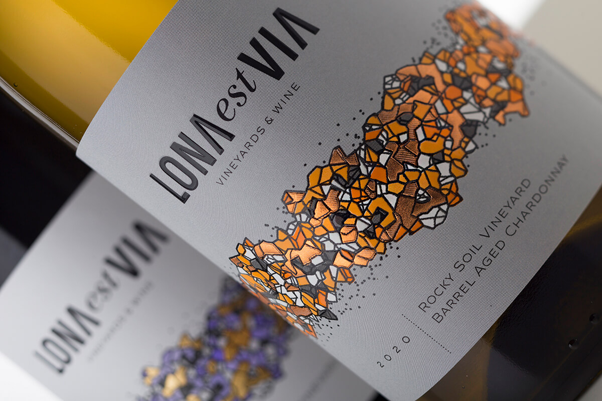 為了增強(qiáng)所有這些反射,我在每塊印有熱箔的石頭上使用了微壓花和強(qiáng)力壓花,而另一個用墨水印刷的則在上面涂上了凸起的清漆,這樣最后整個條紋看起來像一個 3D 圖像,尤其是在不同的光線條件下. 我的主要想法是在這個包裝標(biāo)簽中創(chuàng)建非常吸引人的彩色條紋,以便人們可以輕松記住它。我還想大聲說,這些石頭是 Sredno Gradishte 村周圍這片神奇風(fēng)土的真正寶藏。標(biāo)簽的頂部中心是“LONA est VIA”標(biāo)題,我使用定制的無襯線字體和藝術(shù)草書字母之間的優(yōu)雅組合來連接 LONA 和 VIA。我想在這個酒標(biāo)設(shè)計上有一個非常清晰易讀的標(biāo)題,但我不想看起來很簡單。