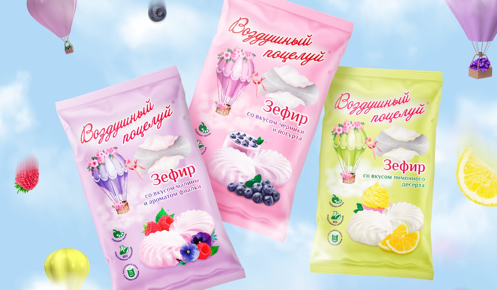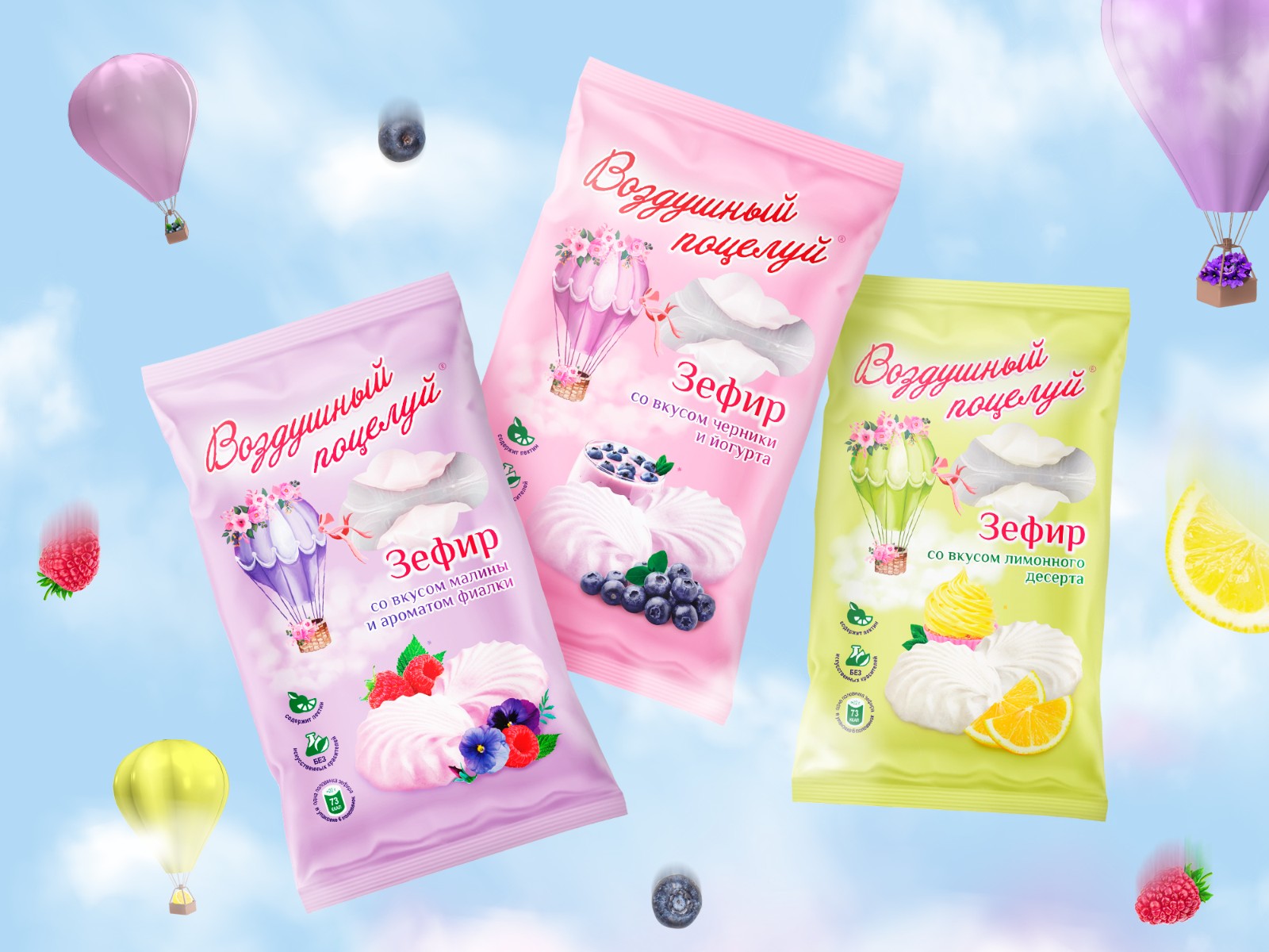 三種口味的棉花糖系列 Air Kiss 的包裝設(shè)計:Sormovskaya Confectionary Factory 品牌的覆盆子紫羅蘭、檸檬甜點、藍莓酸奶。
