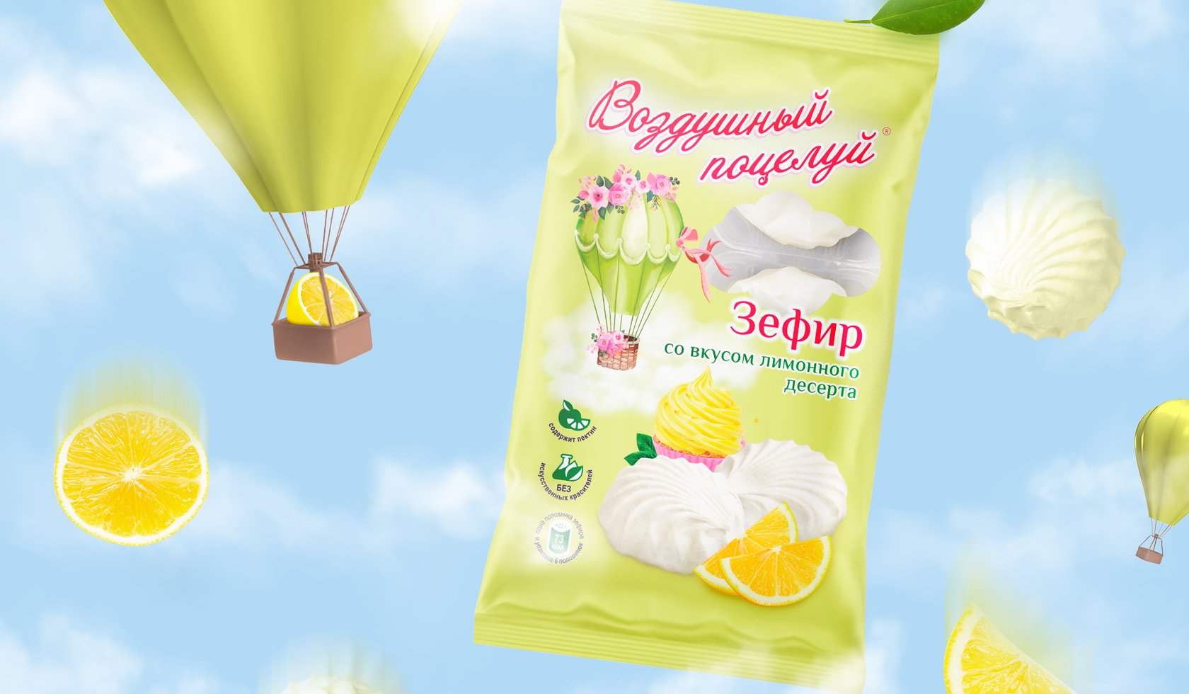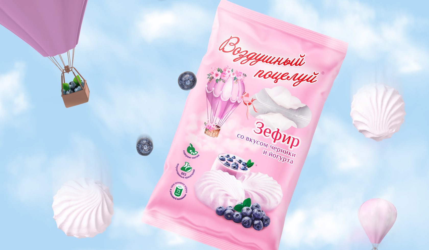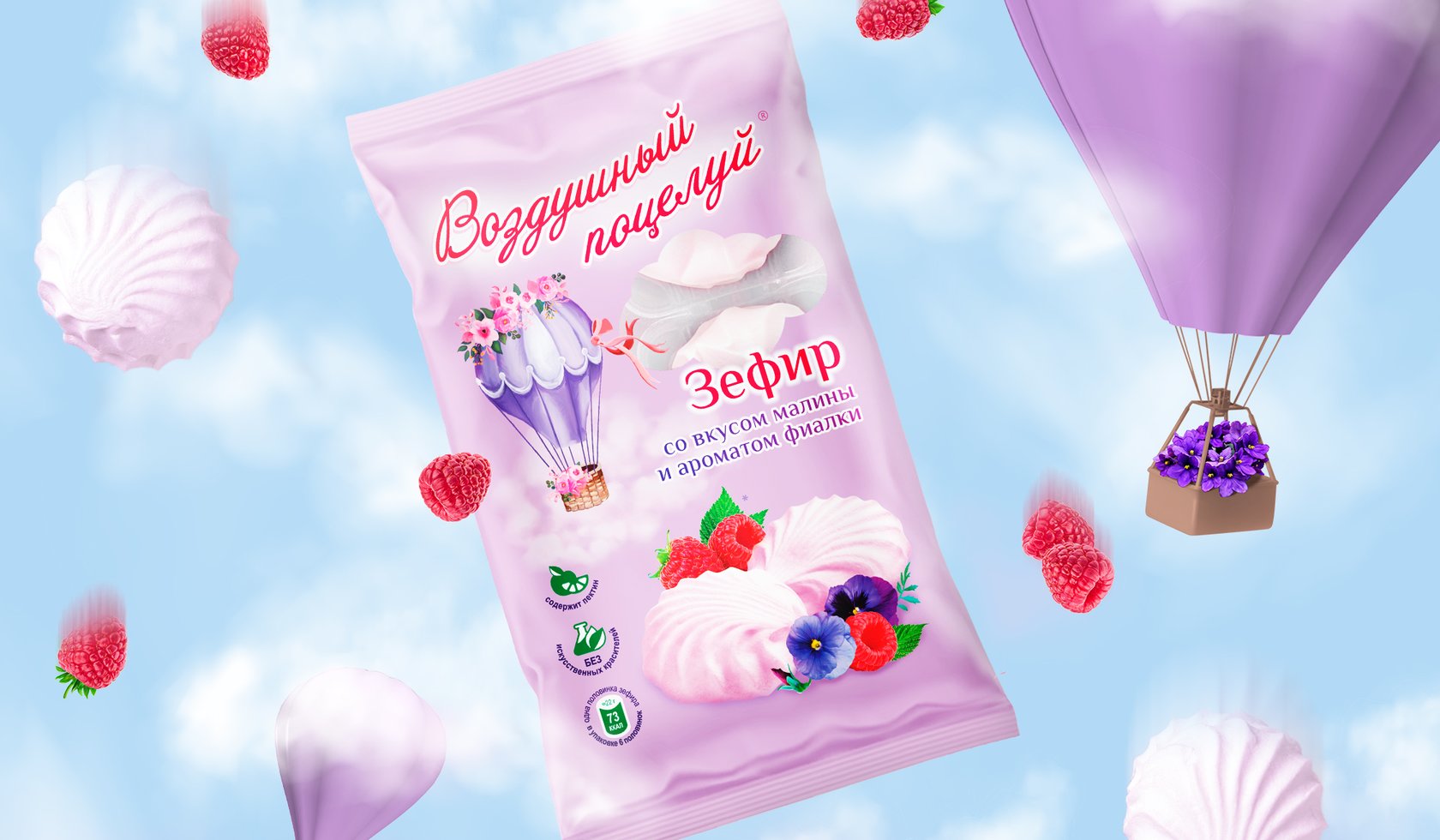 糖果系列的一個特點是為那些想要嘗試新事物的人提供不同尋常的原始口味。因此,對于口味的顏色識別,選擇多汁、歡快但不太鮮艷的顏色,以保持產(chǎn)品的柔軟和柔嫩的感覺。我們開發(fā)了 Air Kiss 系列名稱的風(fēng)格,強調(diào)浪漫和俏皮的心情。作者在背景上繪制的氣球和柔和的云彩的插圖為整體構(gòu)圖增添了輕盈和柔情。